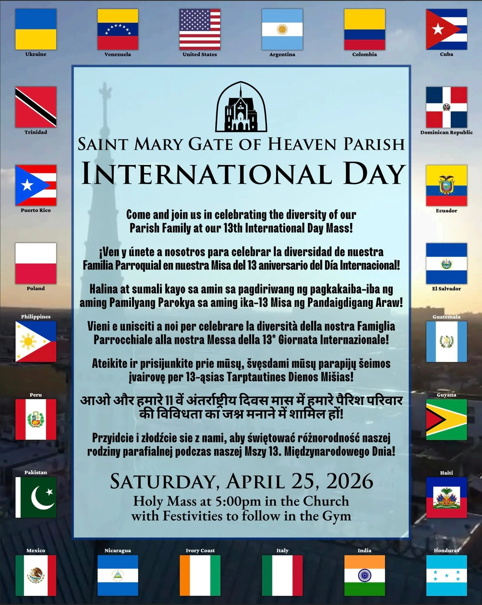 Join us on April 25th for our 13th annual International Day. A day of celebrating our parishes multi-cultural family through food, dance and song. The event begins with Mass at 5pm in the Church with Festivities following in the school gym All are invited to attend